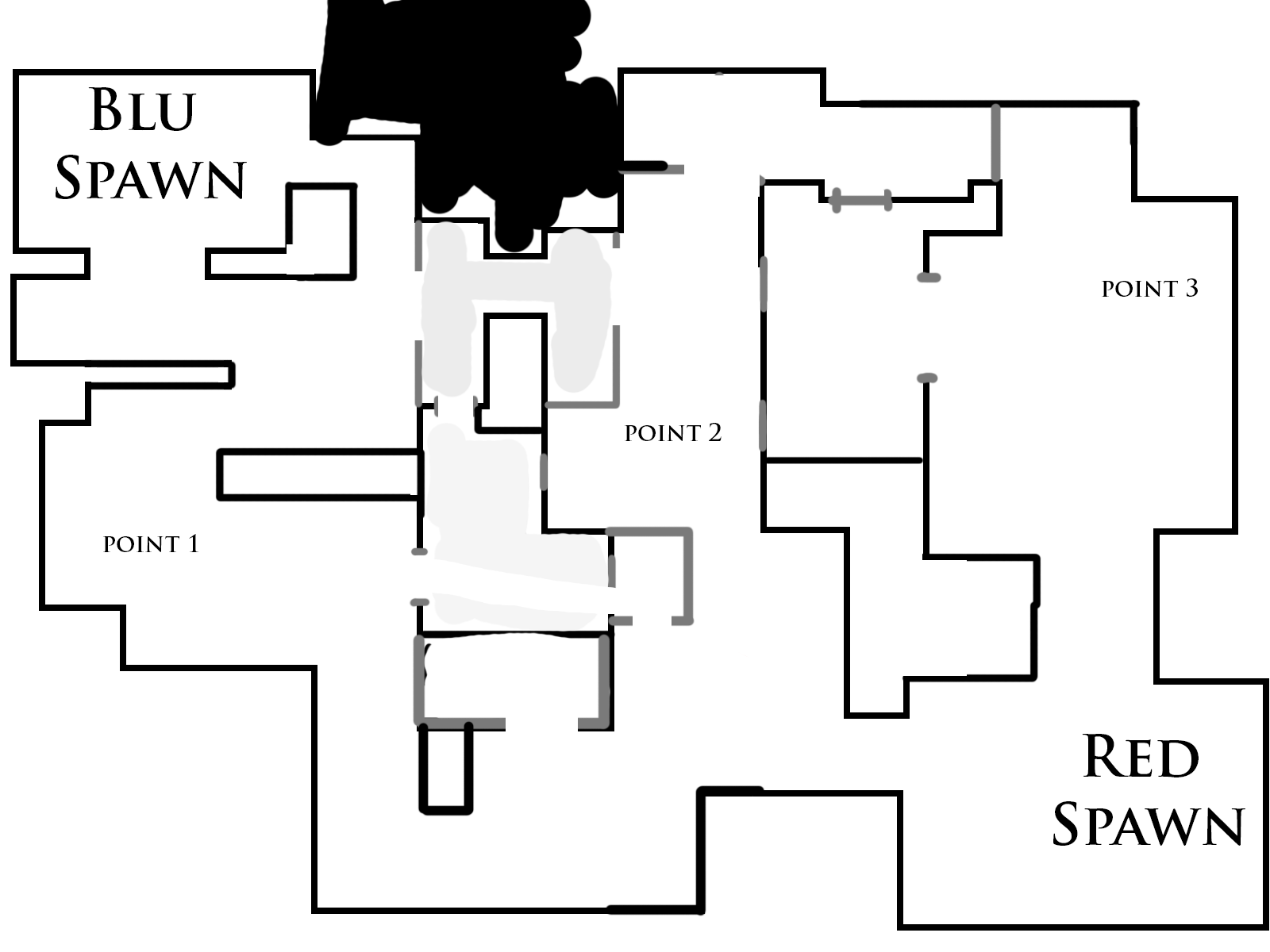 During this part I decided to draw blue and red lines flowing through the map. I have found this "drawing of flow lines" very useful as it allows me to see glaring issues which were previously hard to see. a good example is the very bottom of the map where Red only had one real way of getting to Point1. I solved this by making the previously unreachable area simply be a heightened platform for 1-way-movement into the Point1-area.